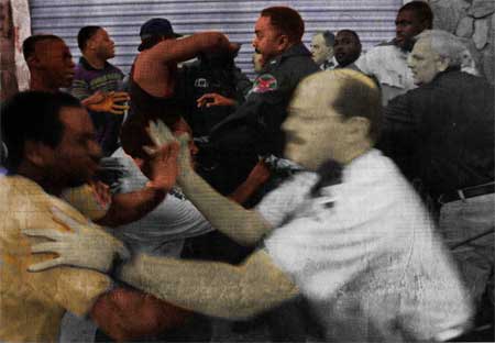 The people then rose up in guerilla warfare, armed with anything they could find from bricks and bottles to automatic weapons, driving the police troops out. Two police were shot, a police helicopter was shot out of the sky and 35 more buildings were burned down to the ground that night. Newspapers the next day quoted the police commander screaming over his radio, "Pull the troops back, we're under heavy fire!"